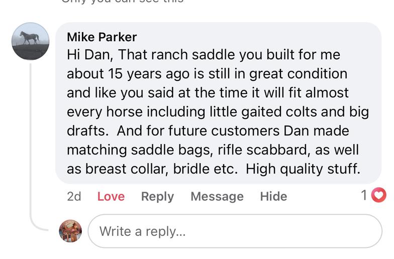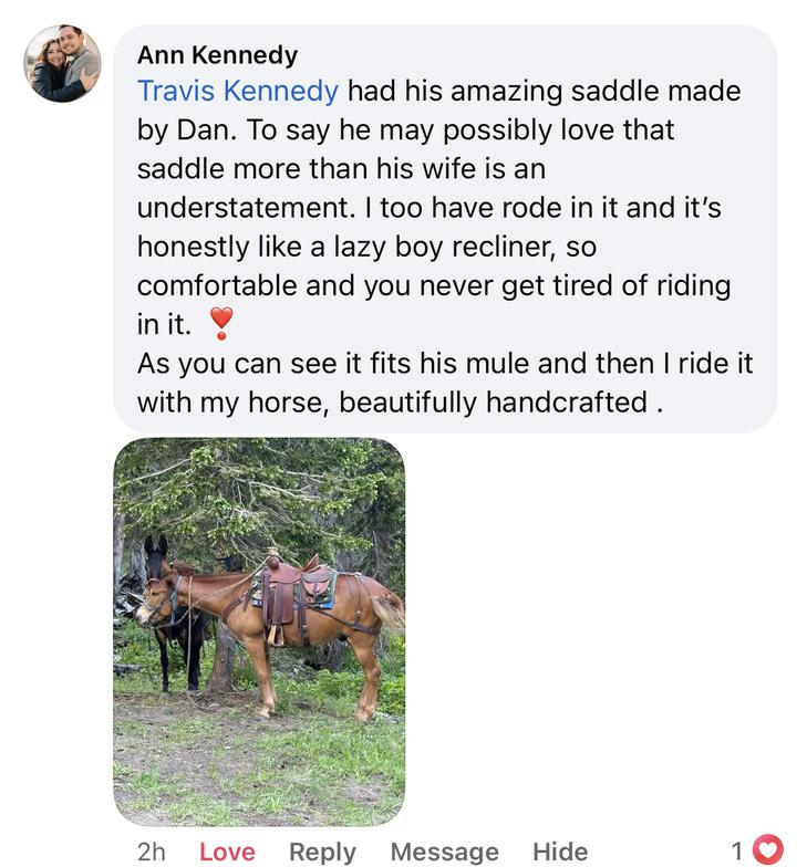 The saddle has been everything you said it would be. I have really enjoyed it and look forward to the years ahead. You do great work. I'm sure I'll need your services in the future!